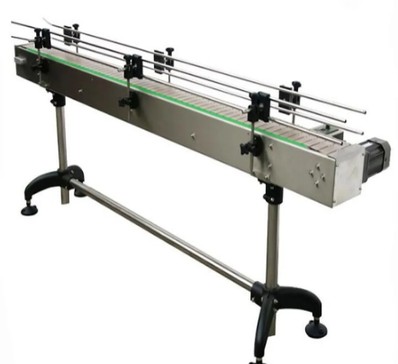 The conveyor is powered by a precision reduction gearbox and motor arrangement that ensures jerk-free, noiseless, and uniform container transfer. High-quality slats provide stable support for containers, while solid SS side guide rails maintain accurate alignment and prevent tipping or jamming during operation.